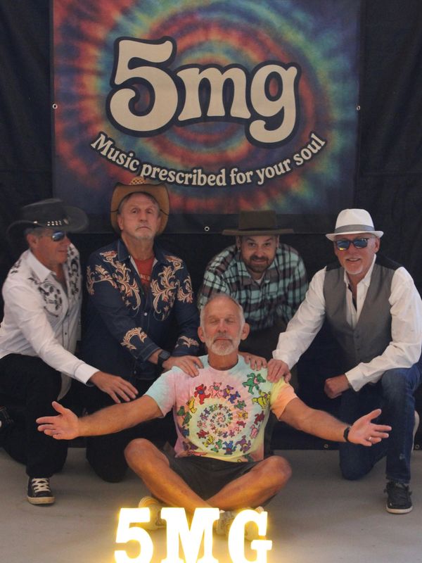 Born from the love of vinyl, loud amps, and melodies that last forever, 5mg is a five-piece classic rock powerhouse rooted in the golden era of music. Inspired by legends like The Beatles, The Rolling Stones, The Doobie Brothers, Buffalo Springfield, Eric Clapton, and Marshall Tucker Band, the band blends familiar favorites with original songs that echo the warmth, soul and bang of the '70s — with a fresh edge that’s all their own.